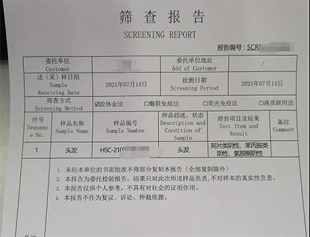 在上面的筛查报告中,阿片类、苯丙胺类、氯胺酮类检测为“阴性”,说明毛发中的各代谢物含量未超过阈值。