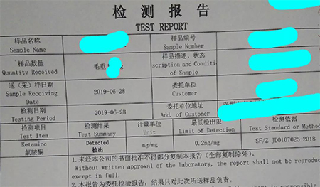 例如:当一个人毛发检测报告中毛发中氯胺酮的检测结果为“阳性”,说明毛发中氯胺酮含量超过规定阈值0.2纳克/毫克,就说明被检测人员之前有吸食过代谢物为氯胺酮的毒品。